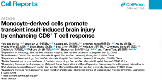 近日,中山大学孙逸仙纪念医院唐亚梅教授团队在Cell Reports发表题为“Monocyte-derived cells promote transient insult-induced brain injury by enhancing CD8⁺ T cell response”的研究论文。该研究基于放射性脑损伤患者样本,结合单细胞RNA和TCR测序、动物模型、谱系追踪等多维实验,揭示外周单核细胞衍生细胞在脑损伤中作为关键抗原呈递细胞,可通过CD80/CD86共刺激信号增强CD8⁺ T细胞反应,进而加剧神经元损伤和认知功能障碍。