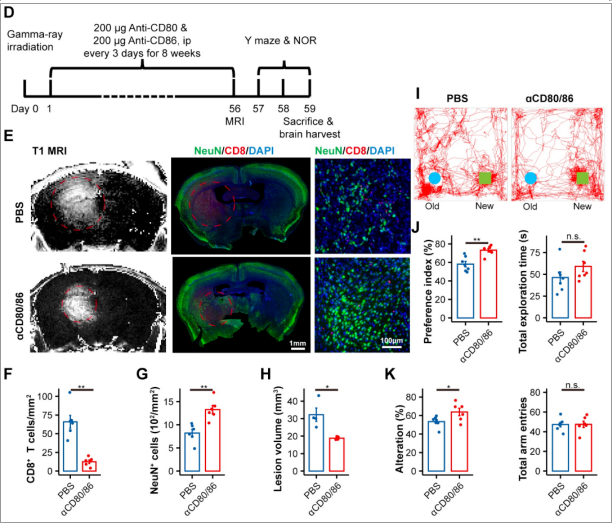 在免疫机制层面,单细胞测序与TCR测序进一步揭示,CD8⁺ T细胞在RIBI脑组织中发生明显的克隆性扩增并获得细胞毒性表型,提示其在脑内经历二次激活。细胞通讯分析显示,moDCs通过CD80/CD86共刺激分子与CD8⁺ T细胞表面的CD28受体发生信号互作,从而增强后者的活化、克隆扩增和效应分化。阻断CD80/CD86后,小鼠脑内CD8⁺ T细胞显著减少,神经元损伤和认知功能障碍改善,进一步证明该共刺激信号轴在调控CD8⁺ T细胞神经毒性反应中的关键作用(图3)。值得强调的是,这一机制在缺血性卒中模型中同样被观察到。