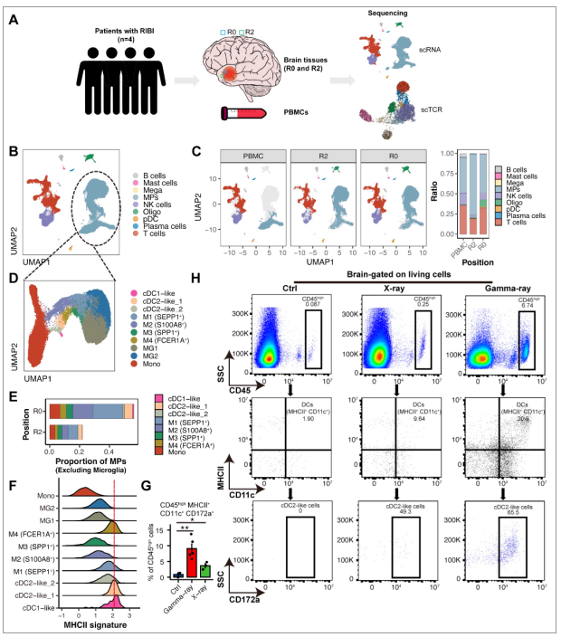 图1. cDC2样细胞浸润放射性脑损伤病人和小鼠模型脑组织。