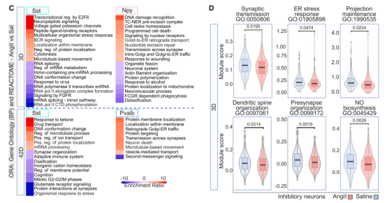 具体来说,注射AngII 3天后皮层中间能神经元氧化还原、细胞应激反应及钾稳态相关基因表达上调,兴奋性神经元突触功能相关的基因表达上调,表明早期HTN期间中间神经元的突触功能出现紊乱,同时兴奋性神经元的突触功能增强,即兴奋-抑制失衡。注射42天AngII后皮层兴奋性神经元与调控突触组织蛋白和突触结构相关的基因表达显著上调,兴奋性突触AMPA受体相关基因表达上调,表明兴奋性神经元活动增强。
