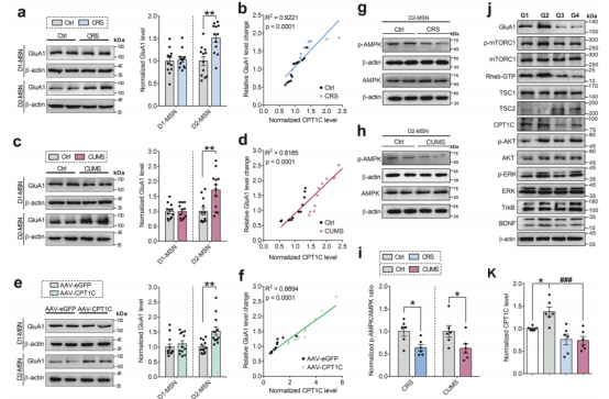图3、NAc脑区D2-MSNs中CPT1C介导通过调控GluA1的蛋白质合成介导慢性应激诱导的小鼠抑郁样行为