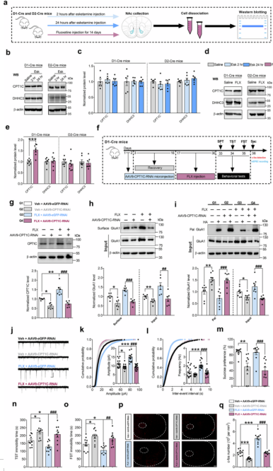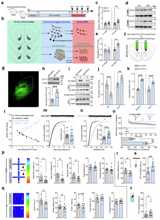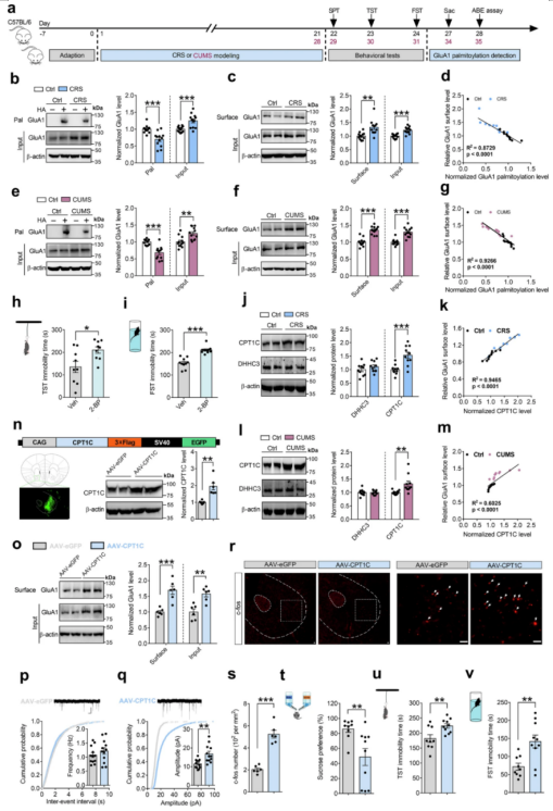 图1、CPT1C介导的GluA1棕榈酰化异常诱导抑郁样行为