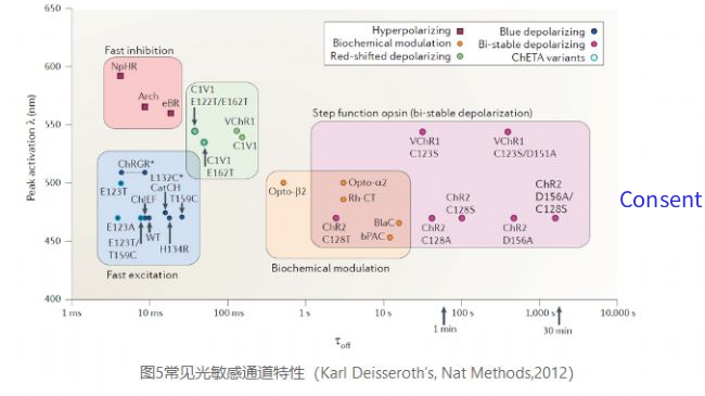 上述这种神奇的光控技术就是光遗传学(optogenetics)。光遗传学是一项整合了光学、遗传学、电生理等多学科的生物工程技术。其主要原理是采用基因操作技术将光感基因(如ChR2,NaHR3.0,Arch或OptoXR等)转入到特定类型的细胞中进行特殊离子通道或GPCR的表达。光感离子通道在不同波长的光刺激下会对离子的通过产生选择性,从而造成细胞膜两边的膜电位发生变化,达到对细胞选择性地兴奋或者抑制的目的。