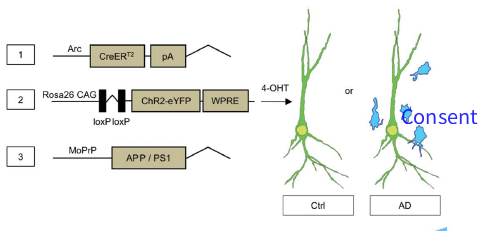 哥伦比亚大学研究者在2017年就已发表文章,称通过光遗传学的手段能够恢复阿尔茨海默症小鼠的记忆。研究人员通过对小鼠进行光遗传学改造,使其在储存记忆和重新获取记忆的时候发射不同颜色的荧光。研究人员对改造的野生型小鼠与阿兹海默症小鼠进行相同气味依赖的恐惧记忆训练。一周之后再次给这些小鼠柠檬气味的刺激,结果显示野生型小鼠能够同时出现黄色与红色的荧光,而且出现了恐惧的表现,而阿尔茨海默症小鼠大脑发光的区域则明显不同,相比较说明它们的大脑在记忆重新获取的过程中发生了紊乱。研究者们利用蓝光刺激小鼠的大脑,激活小鼠对气味及电击的记忆,当小鼠再次闻到上述气味的时候出现了颤栗的表现,记忆得到恢复。