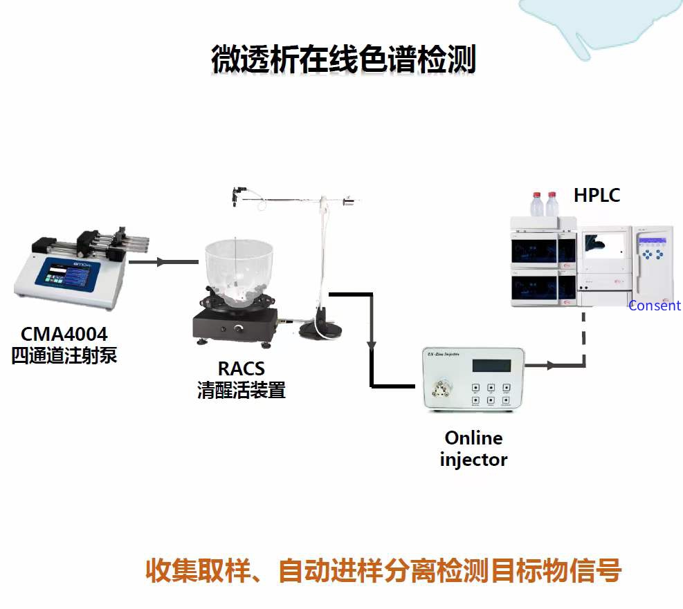 微透析法(Microdialysis)是一种对待测组织损伤相对较小、灵敏度较高的方法,被广泛用于检测大脑中的各种生物分子,包括神经递质、激素以及其它化学小分子的分布和动态变化过程。微透析系统含 有一个微透析探头,探头前端被半透的中空纤维膜覆盖,两端与人工脑脊液(Artificial cerebrospinal fluid, ACSF)的入口管和出口管相连。使用该系统检测大脑中神经递质的动态变化,首先要将微透析探 头插入待研究的脑区,并对该系统灌流 ACSF,使其以 0. 5 ~ 2. 0 滋L / min 的速度持续不断地通过微透析探头前端的半透膜,与大脑中的脑脊液进行物质交换,在此过程中,细胞外液中的神经递质通过被动扩散作用穿过半透膜进入ACSF, 之后回收透析液,利用高效液相色谱(High performance liquid chromatography,HPLC)或气相色谱(Gas chromatography,GC)将不同的神经递质分离出来,通过质谱 (Mass spectroscopy, MS) 分析脑脊液中每种神经递质的含量, 最终实现对神经递质的检测。由于此系统持续地对微透析探头灌流 ACSF,因此在样品采集位置很难建立神经递质的化学梯度平衡,导致透析液中的神经递质浓度低于采样位置的实际浓度。为了提高对采样位置神经递质浓度测量的准确度,可通过降低 ACSF 的灌流速度使其尽量建立平衡; 同时,为保证样品中神经递质的含量足够在后续系统中被检测出来,只能在一定程度上降低该系统的采样频率,导致该系统的时间分辨率较低。尽管微透析法可在复杂的神经系统中实现对各种神经递质相对精确、灵敏、长时程的检测,但由于其时间分辨率比较低,单次采样时间通常约10min,因此很难实时地检测大脑中快速变化的神经递质。