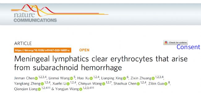 近期,上海中医药大学王拥军教授、梁倩倩研究员(通讯作者)带领陈锦漫博士等团队成员,在《Nature Communications》(IF:11.878)杂志发表了题为“Meningeal lymphatics clear erythrocytes that arise from subarachnoid hemorrhage”的研究文章。