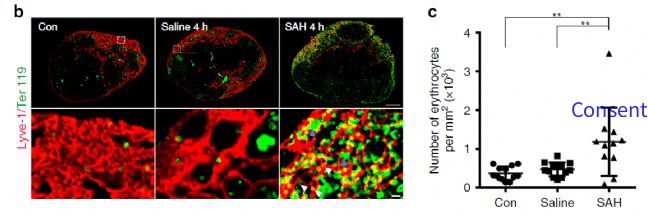 通过体内实验研究证实,在蛛网膜下腔出血4个小时后,颈部淋巴结和硬脑膜淋巴管聚集了大量红细胞。