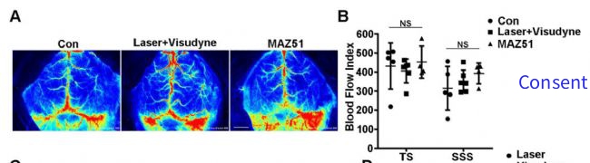 同时,利用PSI激光散斑血流视频成像系统验证淋巴消融与VEGFR3阻断,不会改变颅脑皮层血管分布,进一步说明整个实验的有效性。
