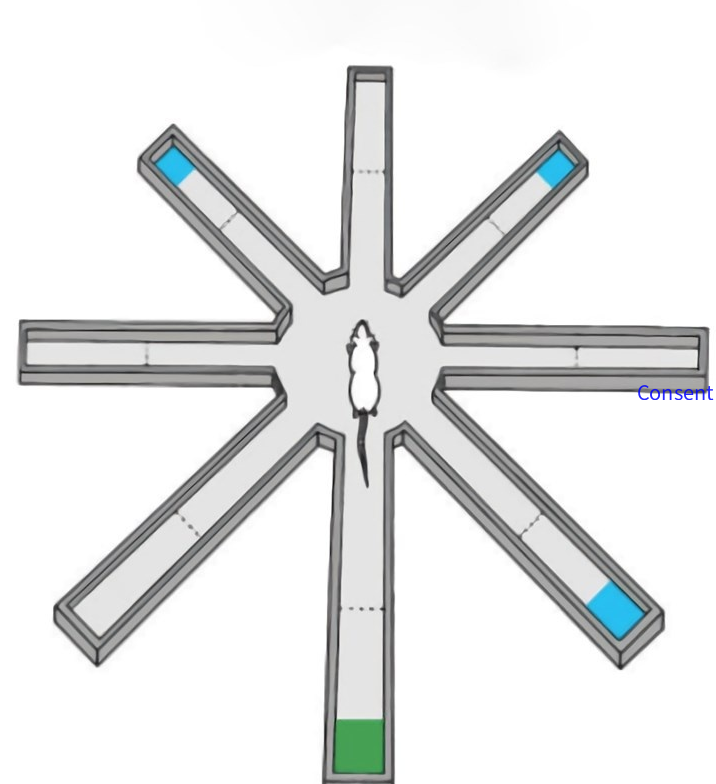 八臂迷宫(8-Arm Maze)用来检测药物或大脑受损状态下学习和记忆方面的表现,它由八个完全相同的臂组成,这些臂从一个中央平台放射出来,所以又被称为放射迷宫(Radial Maze)。八臂迷宫操作简便、可行,而且能区分短期的工作记忆和长期的参考记忆,现已被广泛用于学习记忆功能评价。