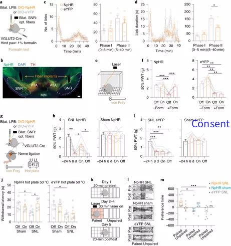 a-f, 光遗传学抑制LPBVGLUT2 → SNR对福尔马林试验中lick相关行为学和机械性痛阈的影响。g-m, 光遗传学抑制LPBVGLUT2 → SNR对神经结扎模型动物的机械痛阈、热痛阈和条件性位置偏爱的影响。