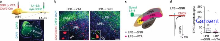 为了解开这一谜团,研究人员首先发现了脊髓后角的上行纤维主要投射到LPB → SNR神经元,且电生理记录显示该投射形成兴奋性连接。