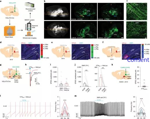 通过光遗传学激活LPBVGLUT2,结合离体脑片电生理记录,研究人员发现LPB与SNR的GABA能神经元形成兴奋性连接,与VTADA → NAcLat神经元也形成兴奋性连接,而VTA的GABA能神经元很少受LPB的支配。值得注意的是,LPB与VTADA形成兴奋性连接,与VTADA在疼痛刺激下活动受抑制的事实相矛盾。