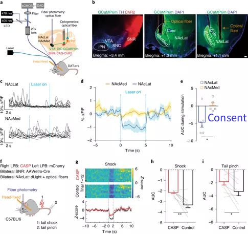 a-e, 光遗传学激活SNR → LPB的神经纤维时,对VTADA投射到NAcLat和NAcMed的神经纤维的钙信号记录。f-i, 选择性消融LPB → SNR对tail shock和tail pinch引起的NAcLat中DA荧光指示剂(dLight1.2)信号的影响。
