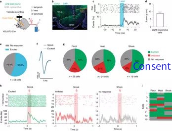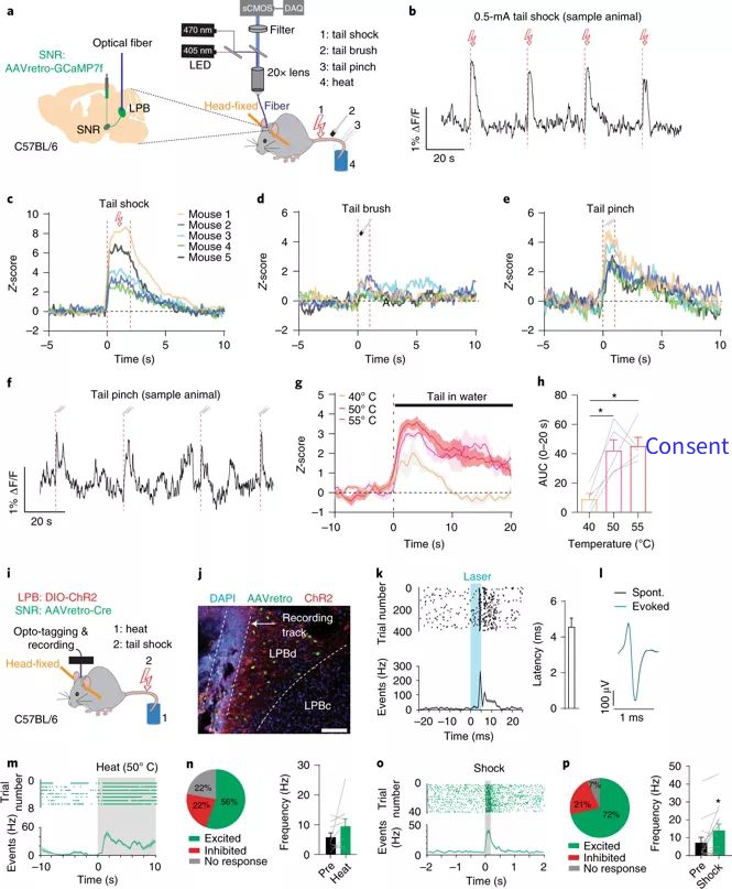 首先,研究人员利用在体电生理记录发现,当光激活LPB → SNR时,所记录的57%的SNR神经元增加了放电。并且这些神经元在pinch、heat或shock刺激下也增加了放电。