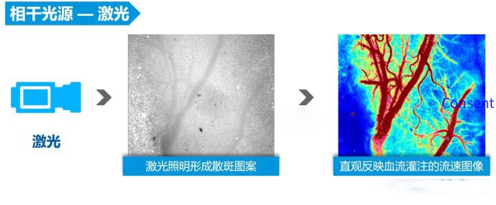 激光散斑血流成像技术的原理为观察目标受到激光束照射时,反射后的激光形成随机干扰图像(包括亮区和暗区),该图像称为激光散斑图。如果被测目标静止,激光散斑图保持不变;如果被测物体发生移动,例如组织中的红细胞运动,则激光散斑图会随之波动。散斑变化速度以散斑对比度量化,而对比度与血流相关;这就是激光散斑血流成像的基本工作原理。