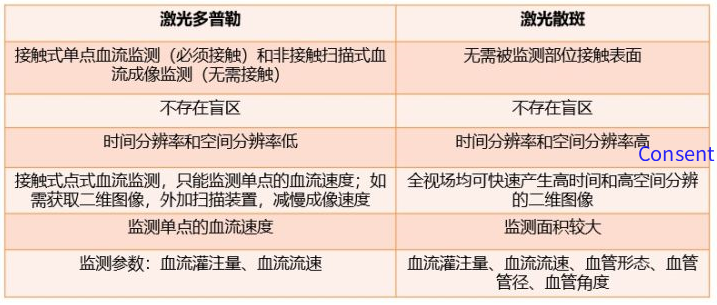 激光血流成像技术主要包括激光多普勒和激光散斑成像两种类型技术,分别运用不同的光学原理监测微循环血流变化和血管形态等技术指标。激光多普勒分为接触式单点血流监测和非接触扫描式血流成像监测两种方式;相对于激光多普勒技术,激光散斑血流成像技术具有非接触、无创伤、快速成像等优点,非常适合进行微循环血流的监测,可实时快速测量血流灌注量、血流流速血管形态结构、血管管径、血管角度等微循环参数。