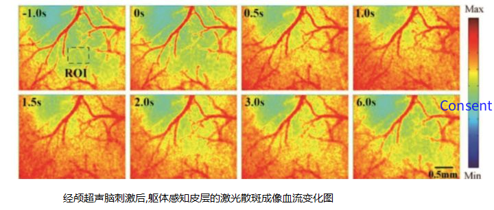 激光散斑血流成像技术的应用远远不止上述的这些,在很多的基础医学研究方面还可以结合其他技术产生更多的应用场景,比如经颅磁刺激(TMS)和经颅超声脑刺激技术等。经颅超声脑刺激技术是近几年发展起来的一种新的脑调控方法,该技术透过完整的颅骨传递低强度超声能量,对神经元产生生物机械效应,从而无创地调控大脑的神经活动。基于激光散斑成像技术研究经颅超声刺激对小鼠局部脑血流的影响作用,整个实验大致过程:在麻醉状态下,使用超声对小鼠的丘脑进行刺激,并对其大脑皮层躯体感知区域进行连续成像,用激光散斑血流成像仪监测小鼠在丘脑受到超声刺激时,皮层对应区域的局部脑血流响应。