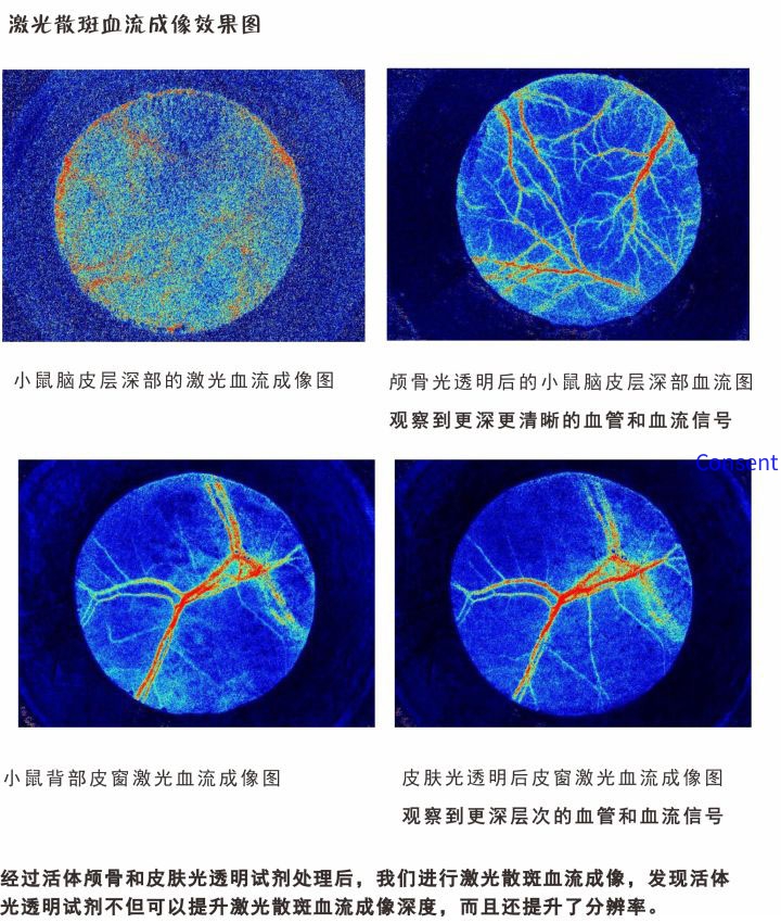 激光散斑血流成像能够观察皮下的血管和血流,如果想观察更深的血管和血流图像,那么完整颅骨将是主要障碍。在很多动物实验中都需要开颅手术以进行相关的成像观察,为了克服这一障碍,科研工作者们开发出几种类型的颅窗,包括磨薄颅窗、开颅手术和磨薄加固颅窗等。这些颅窗在某些情况下满足研究要求,但也会带来诸多问题:1、在颅骨窗变薄的情况下,很难进行大面积重复成像;2、开颅手术几乎不可避免地会导致皮质损伤和炎症;3、至于磨薄加固颅窗操作复杂且也会造成损伤