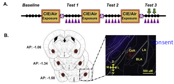 暴露在应激环境中激活 DYN/KOR 系统,引发焦虑和焦虑行为。全身性或在CeA区域注射KOR 拮抗剂能够降低大鼠的酒精摄取行为。CeA脑区富集表达强啡肽和к阿片受体,敲除该区域的PYDN(强啡肽前体)后降低酒精摄入。