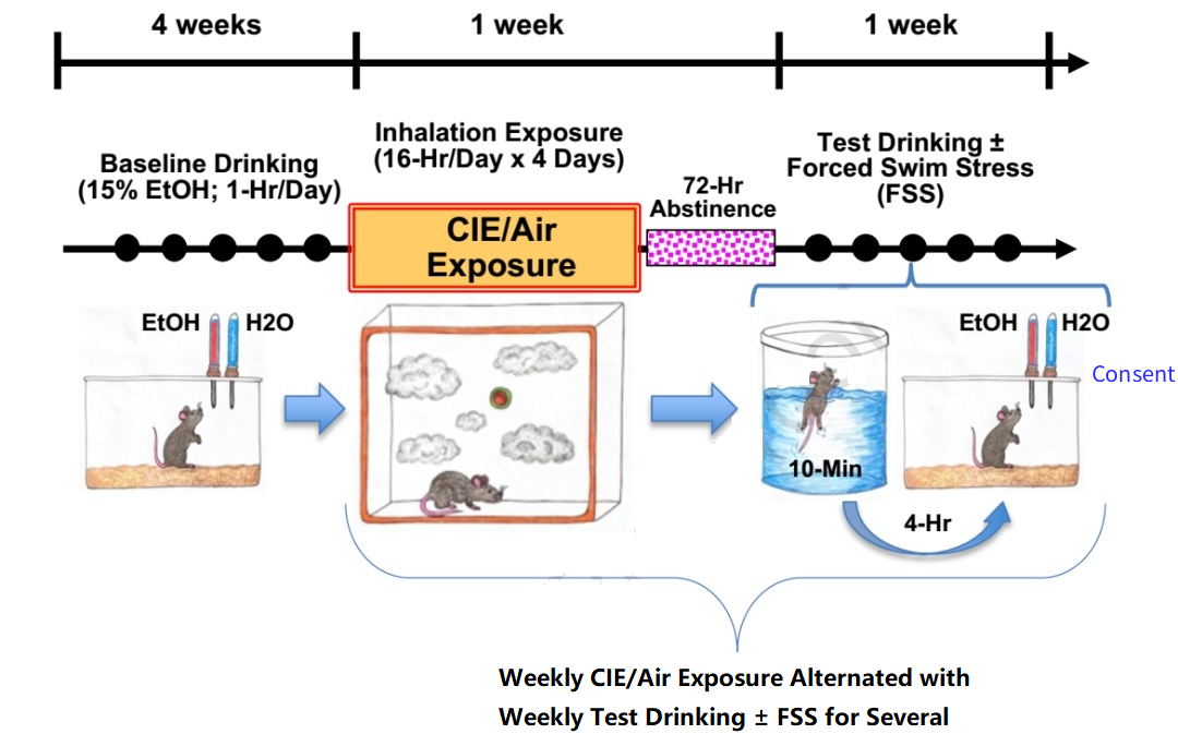 研究人员通过慢性间歇性酒精暴露模型(每天给与1小时的15%的酒精,连续一个月)结合强迫游泳实验模拟应激环境下的饮酒行为(图1),发现应激能够显著促进成年小鼠的饮酒行为,CeA区域的PYDN基因的mRNA表达增加,这种增加仅发生在同时接受慢性应激和酒精暴露的环境下,单独应激或酒精暴露均不会引起PYDN基因表达的变化。简单来说,慢性应激的这种促进酒精饮用的效应仅仅发生在曾经有过慢性酒精暴露史的小鼠中。