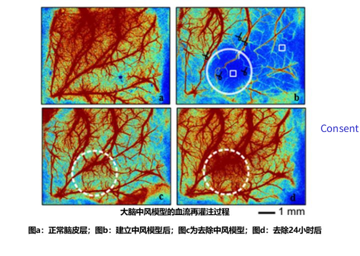 脑卒中”(cerebral stroke)又称“中风”、“脑血管意外”(CVA),是一种急性脑血管疾病,是由于脑部血管突然破裂或因血管阻塞导致血液不能流入大脑而引起脑组织损伤的一组疾病,包括缺血性和出血性卒中。缺血性卒中的发病率高于出血性卒中,占脑卒中总数的60%~70%。颈内动脉和椎动脉闭塞和狭窄可引起缺血性脑卒中,严重者可引起死亡。脑卒中具有发病率高、死亡率高和致残率高的特点。激光散斑血流成像技术可用于动物实验的脑卒中研究。