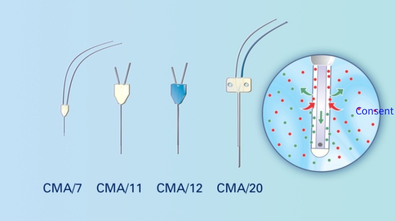同心圆探针根据探针用途可分为脑部探针和血液探针。脑部探针如CMA探针有CMA 7、CMA 11和CMA 12。其中CMA 7用于小鼠离散大脑区的一种细硬质探针,CMA 11则是用于大鼠离散大脑区的一种细硬质探针,而CMA 12是用于中枢神经系统研究的最佳探针,可长期植入。CMA的血液探针型号为CMA 20,CMA 20 是一种软性的金属探针,主要用于清醒自由活动动物或麻醉动物的肌肉、心脏、皮肤和脂肪等。