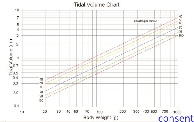 如选择容积控制模式,根据如下参考,选择相对应的动物的潮气量和呼吸频率。