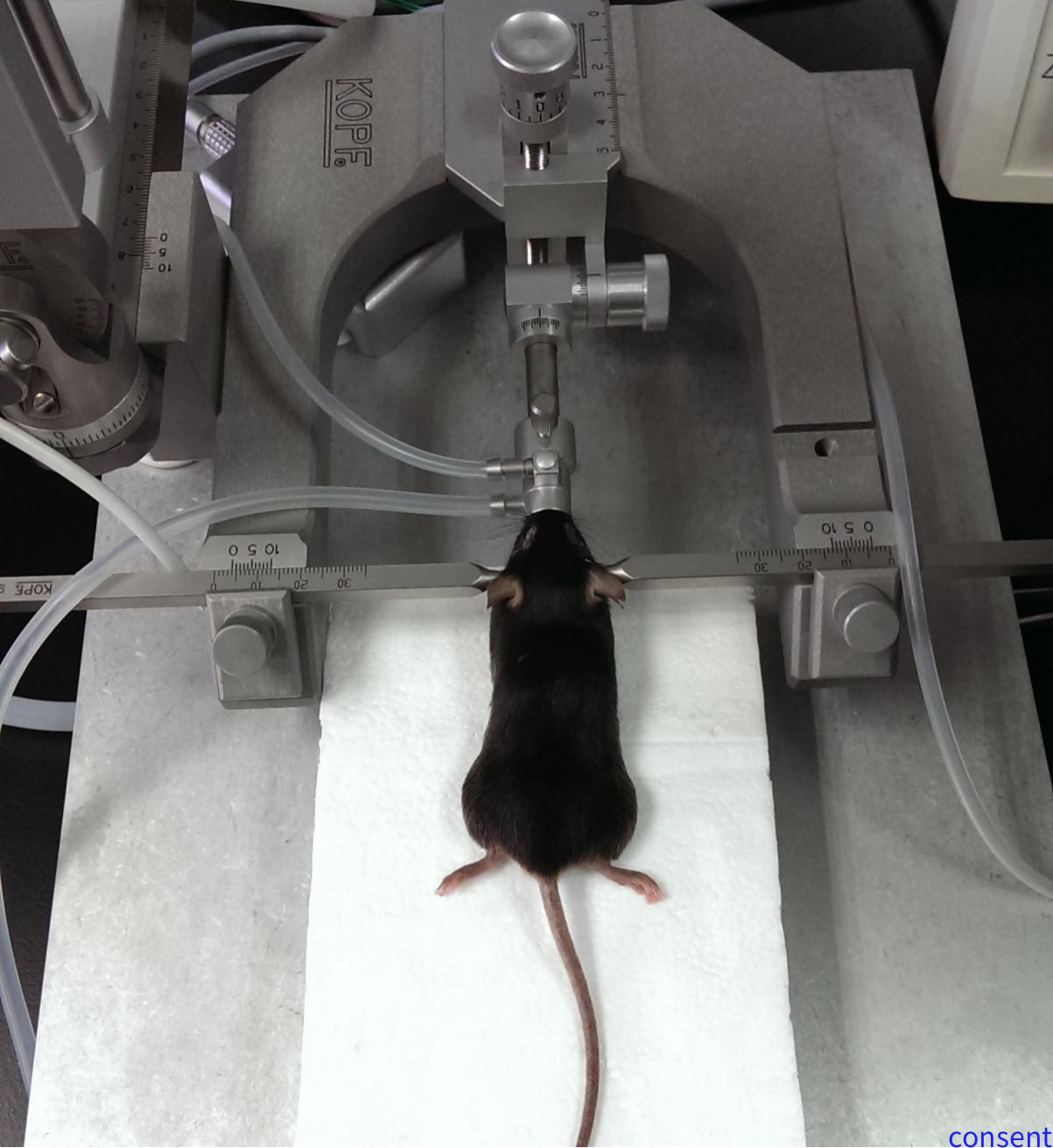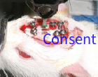 麻醉对整个手术至关重要,其麻醉的稳定性直接影响到手术结果的好坏。若要获得更好的麻醉效果,建议使用异氟烷呼吸麻醉,但由于呼吸麻醉成本较高且麻烦,多数实验室还是使用注射麻醉,因此这里以注射麻醉为例。麻醉剂采用1%戊巴比妥钠溶液(戊巴比妥钠比水合氯醛麻醉更稳定,但容易产痰,需要备吸管帮助吸出痰),剂量为0.5m/100g(50mg/Kg)。腹腔注射前先对大鼠用异氟烷短暂麻醉,具体操作:将大鼠放进透明盒子中,此时将蘸有异氟烷的棉球丟入盒子内,密封,待大鼠安静不动,呼吸均匀(1次/秒)时取出。腹腔注射:将大鼠仰面朝向,提起一侧后肢,在大腿根与腹中线的中间位置刺入皮下,在皮下平行于腹中线推进针头3-5mm,再以45°角向腹腔内刺入,针尖通过腹肌后,无阻力,回抽无回流物,缓慢注入麻药。注射麻药后,对大鼠进行疼痛反射(掐尾端或后脚掌)和眼角膜反射来判断麻醉效果。在15min之后还未能完全麻醉的大鼠可适当补加0.2-0.5m的1%戊巴比妥钠溶液。若手术时间较长,应每隔1h检查大鼠麻醉状态,当出现疼痛反应时,应补加05m的1%戊巴比妥钠溶液。手术中,应将大鼠舌头从口的一侧拉出,为防止大鼠在麻醉过程中呼吸道出现过多分泌物导致窒息,可在麻醉过程中注射0.5m阿托品(1mg/m)