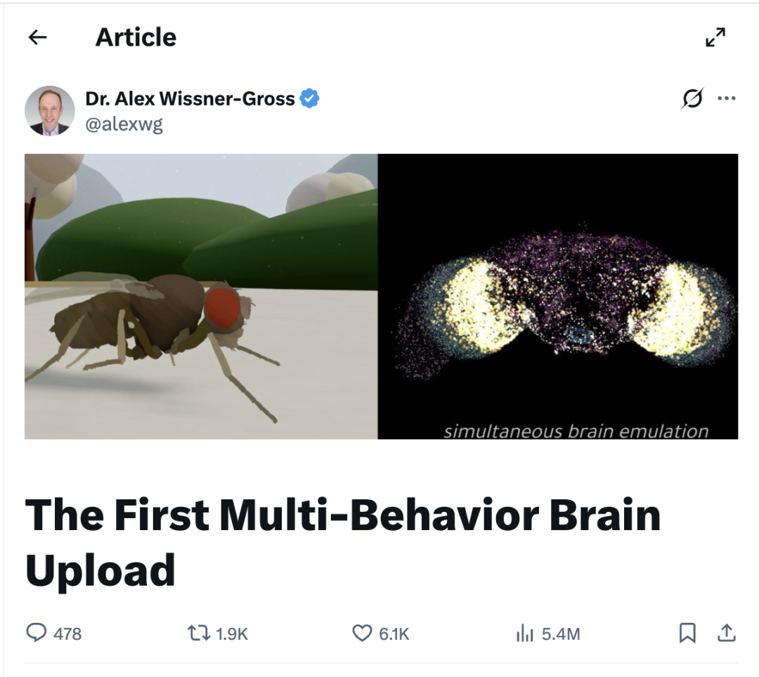 该公司联合创始人Alex Wissner-Gross在社交平台公开解读,这只虚拟果蝇的所有动作,均源于完整果蝇大脑的数字复刻版:每一个神经元、每一条突触都实现1:1精准映射,外界感官信号传入后,神经电信号在复刻的连接组网络内自主传导,最终生成运动指令,交由物理仿真躯体完成动作。这也是人类首次在全脑仿真领域,真正打通从感知到行动的完整闭环,跳出了传统大数据AI的研发逻辑,用实打实的生物脑复刻,打破了微型大脑无法支撑复杂行为的固有认知。